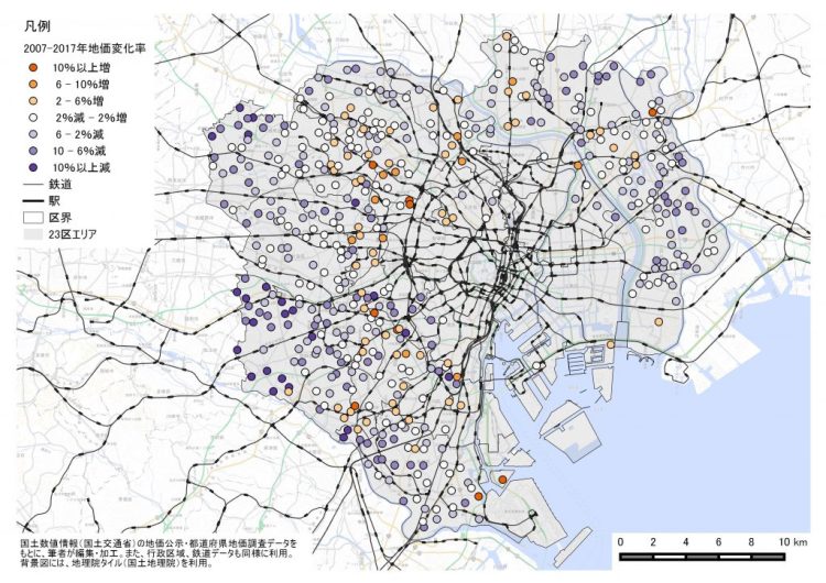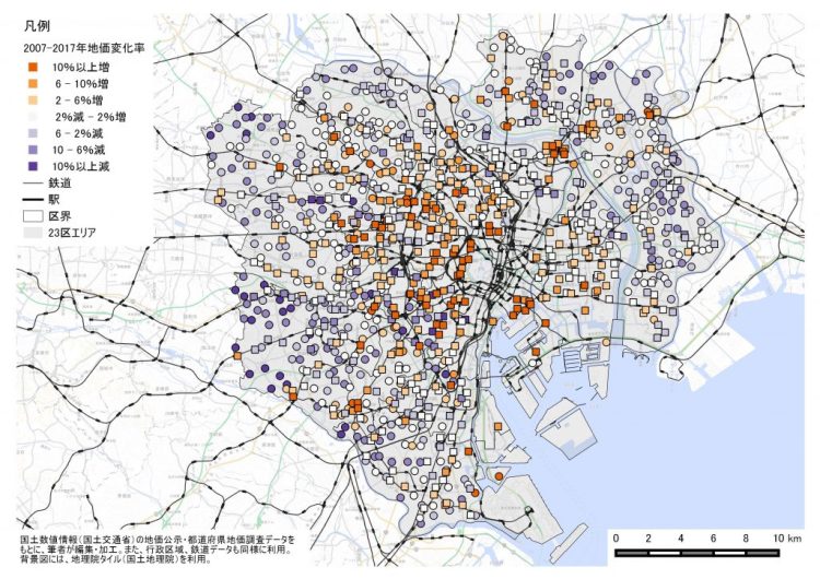 23区における地価の変化(2007~17年)