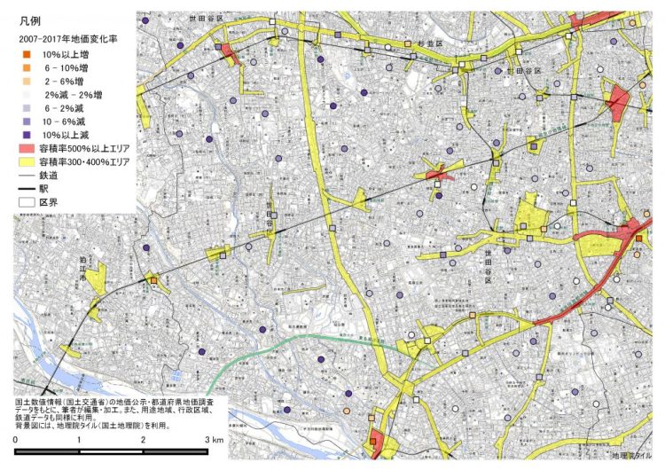 また以下の図⑥は、図⑤における世田谷区を中心としたあたりをクローズアップさせたものです。この図でわかるように、マンション向けエリアでの地価は、6%あるいは10%以上増加しているところが多いのに対し、戸建て住宅エリアは全般的に下落しているところが多く、駅から離れたところなど10%以上減少しているところも結構見受けられます。